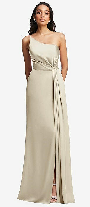One-Shoulder Draped Skirt Satin Trumpet Gown in champagne