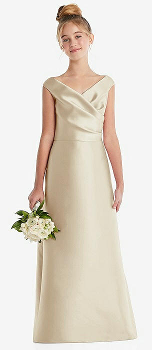 Off-the-Shoulder Draped Wrap Satin Junior Bridesmaid Dress in champagne