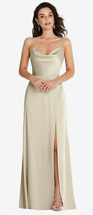 Cowl Neck Satin Maxi Dress with Adjustable Spaghetti Straps in champagne