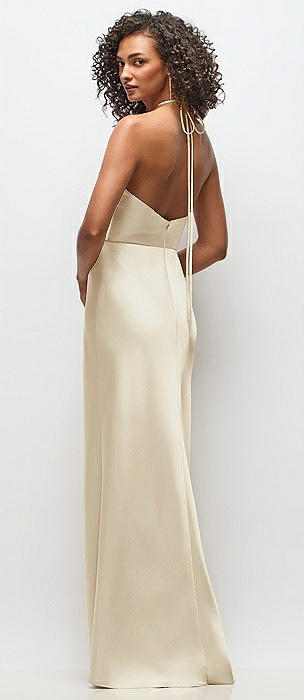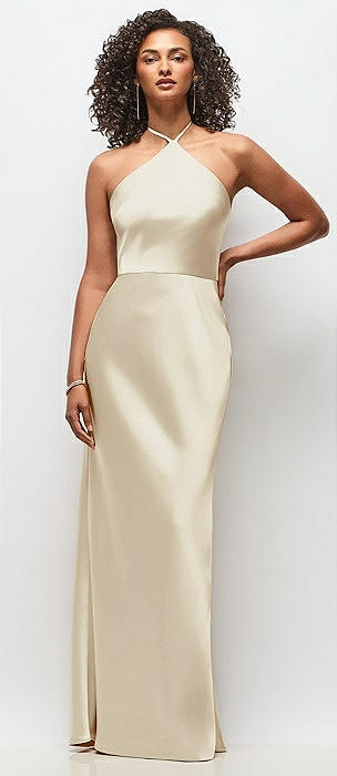 High-Neck Halter Stretch Satin Maxi Dress with Bias A-line Skirt in champagne
