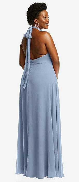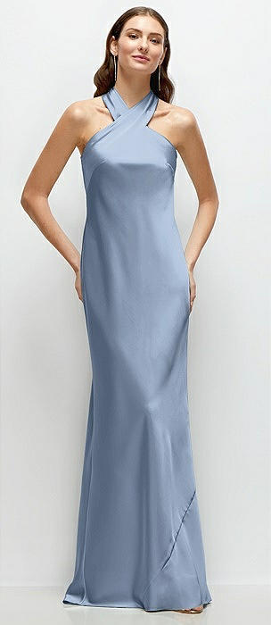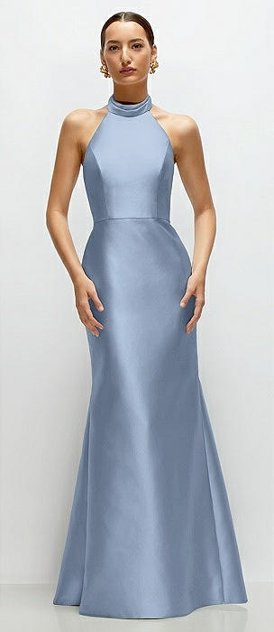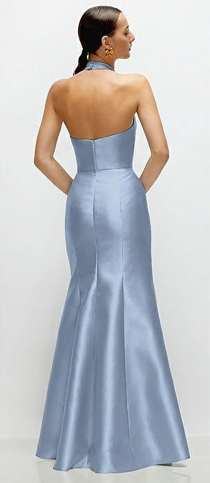High-Neck Halter Open-Back Satin Trumpet Dress in cloudy