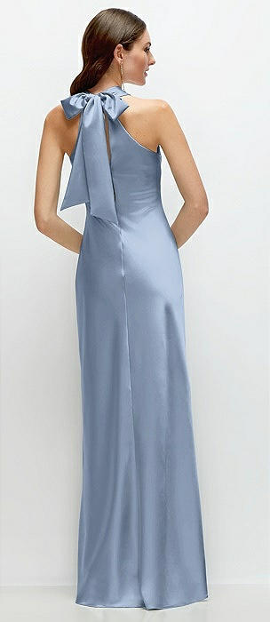 Band Collar Halter Open Back Fluid Satin Maxi Dress with Self-Tie Bow in cloudy