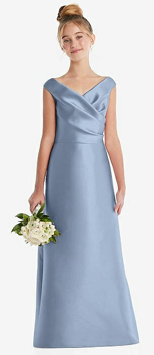 Off-the-Shoulder Draped Wrap Satin Junior Bridesmaid Dress in cloudy