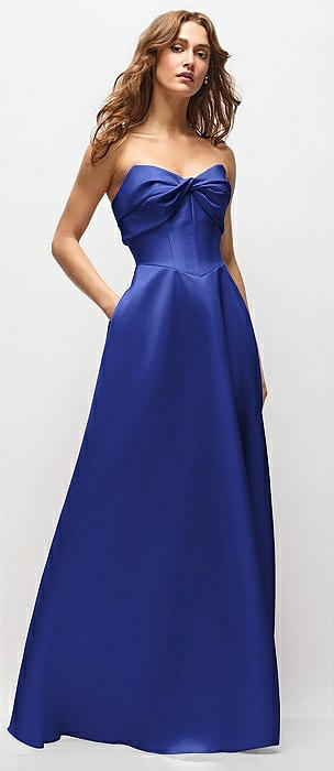 Strapless Twist Cuff Neck Satin Maxi Dress with Basque-Waist & Full Skirt in cobalt blue