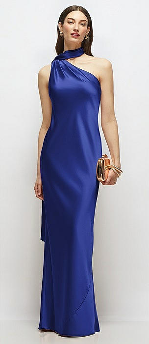 Draped Scarf One-Shoulder Bias Stretch Satin Maxi Dress in cobalt blue