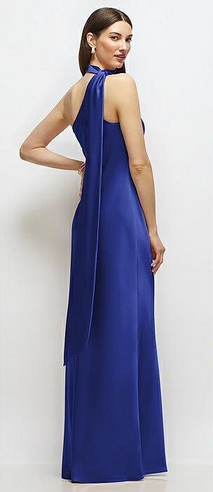 High-Neck Halter Open-Back Satin Trumpet Dress in cobalt blue