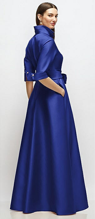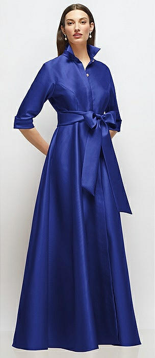 3/4 Sleeve Satin Shirt Dress Gown with Sash and Jeweled Buttons in cobalt blue