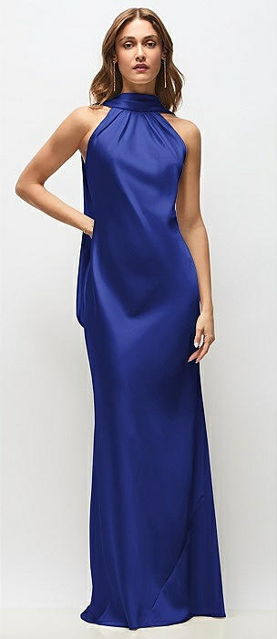 Draped Scarf Halter Open-Back Stretch Satin Bias Maxi Dress with Adjustable Straps in cobalt blue