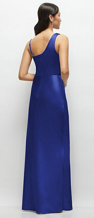 One-Shoulder Cat-Eye Neckline Fit and Flare Satin Maxi Dress in cobalt blue