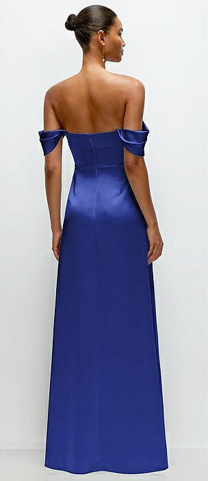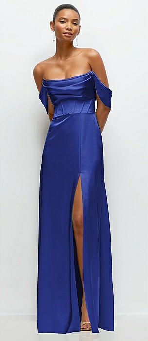 Cowl Neck Off-the-Shoulder Stretch Satin Fit and Flare Corset Maxi Dress in cobalt blue