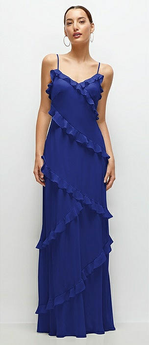 Asymmetrical Ruffle Chiffon Bias Slip Maxi Dress in cobalt blue