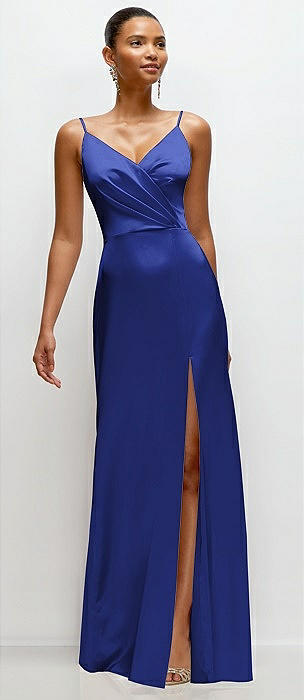 Pleated Faux Wrap Satin Maxi Dress with Adjustable Spaghetti Straps in cobalt blue