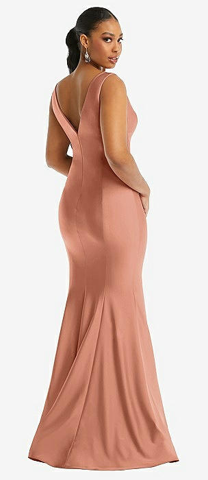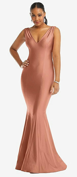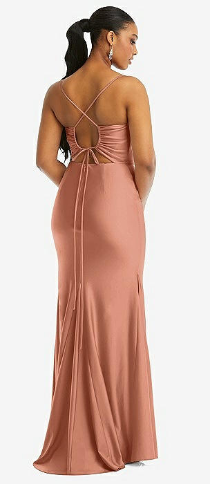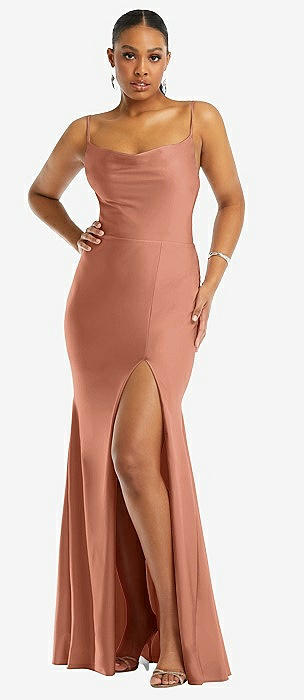 Cowl-Neck Open Tie-Back Stretch Satin Mermaid Dress with Slight Train in copper penny