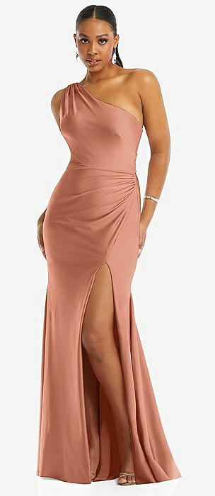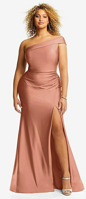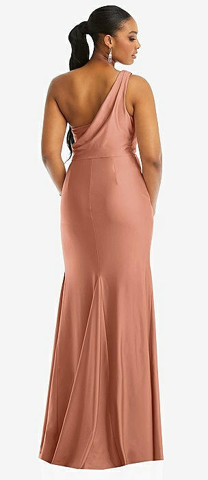 One-Shoulder Asymmetrical Cowl Back Stretch Satin Mermaid Dress in copper penny