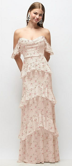 Off-the-Shoulder Cowl Floral Chiffon Tiered Ruffle Maxi Dress with Convertible Ruffle Straps in coquette floral print
