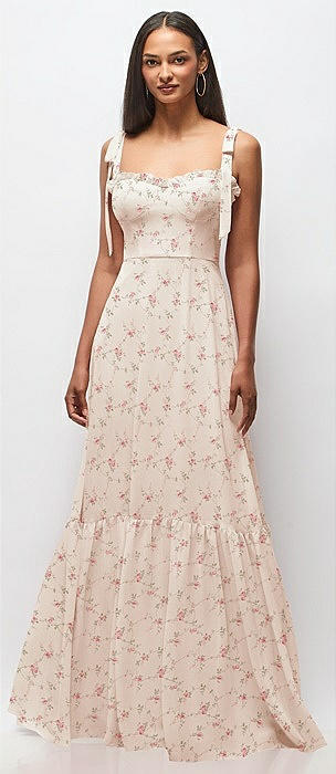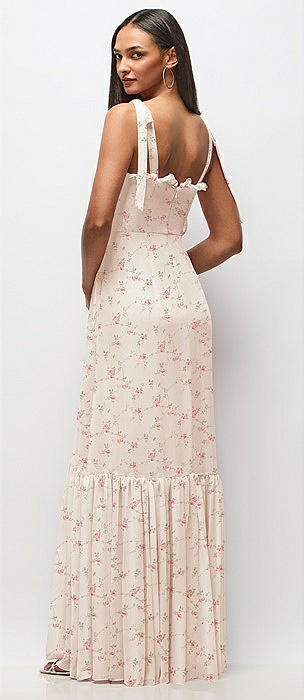 Tie-Shoulder Bustier Bodice Ruffle-Hem Maxi Dress in coquette floral print