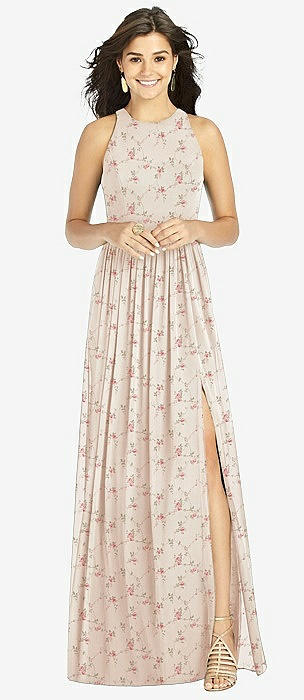 Shirred Skirt Jewel Neck Halter Dress with Front Slit in coquette floral print