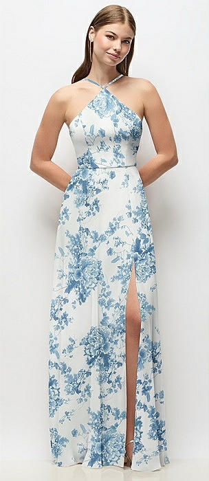 High-Neck Halter Floral Chiffon Maxi Dress with Adjustable Spaghetti Straps in cottage rose dusk blue