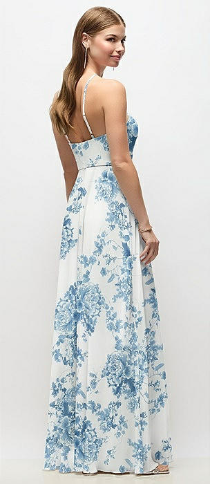 Empire Waist Floral Chiffon Halter Maxi Dress with Convertible Spaghetti Straps in cottage rose dusk blue