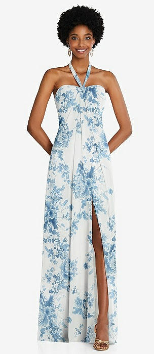 Stand Collar Halter Maxi Dress with Criss Cross Open-Back in cottage rose dusk blue