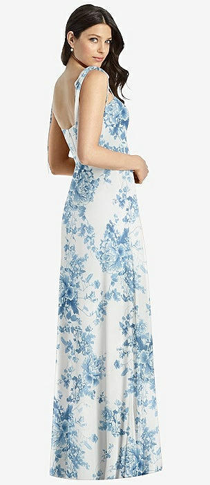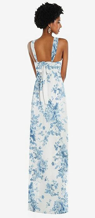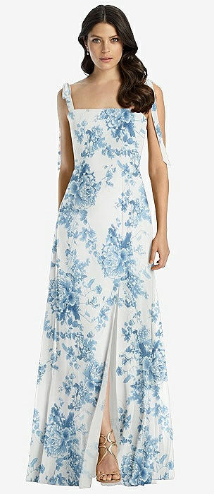 Tie-Shoulder Chiffon Maxi Dress with Front Slit in cottage rose dusk blue