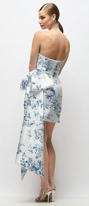 Strapless Pleated Draped Floral Satin Mini Dress with Dramatic Long Tail Bow & Covered Buttons in cottage rose larkspur