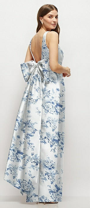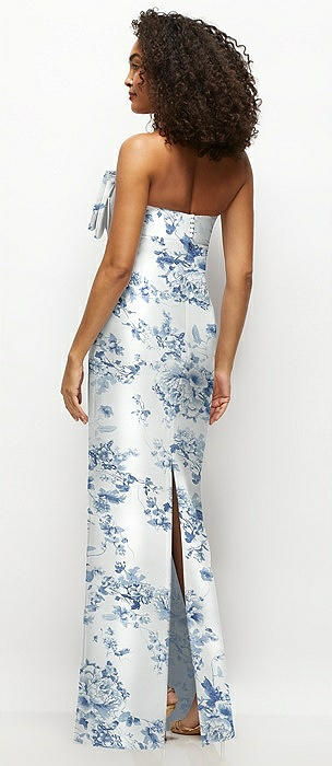 Strapless Floral Satin Column Maxi Dress with Oversized Bow in cottage rose larkspur