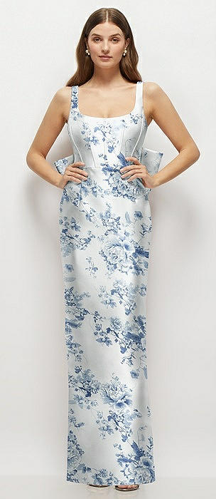 Floral Scoop Neck Corset Satin Maxi Dress with Floor-Length Bow Tails in cottage rose larkspur
