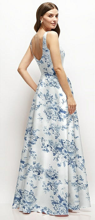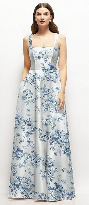 Floral Square-Neck Satin Maxi Dress with Full Skirt in cottage rose larkspur