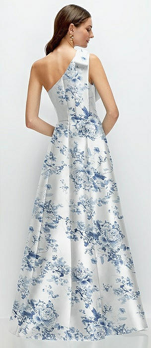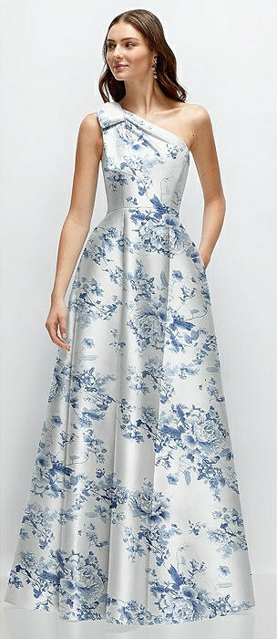 Bow One-Shoulder Floral Satin Trumpet Gown in cottage rose larkspur