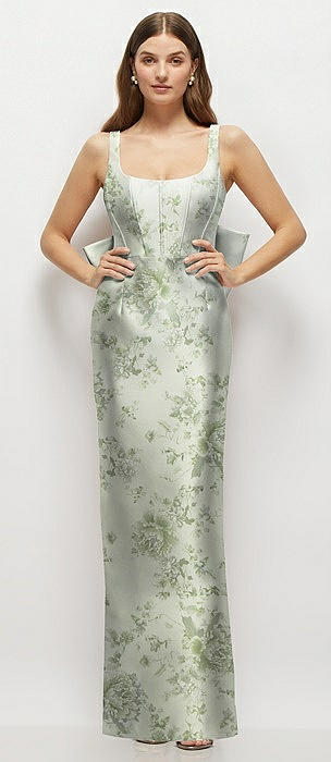 Floral Scoop Neck Corset Satin Maxi Dress with Floor-Length Bow Tails in sage cottage rose