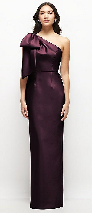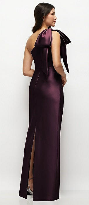 Oversized Bow One-Shoulder Satin Column Maxi Dress in deep plum