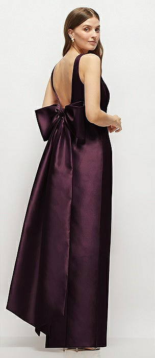Deep V-back Satin Trumpet Dress with Cascading Bow at One Shoulder in deep plum