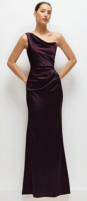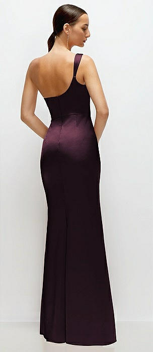 One-Shoulder Cat-Eye Neckline Fit and Flare Satin Maxi Dress in deep plum