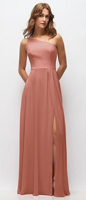 One-Shoulder Chiffon Maxi Dress with Shirred Front Slit in desert rose