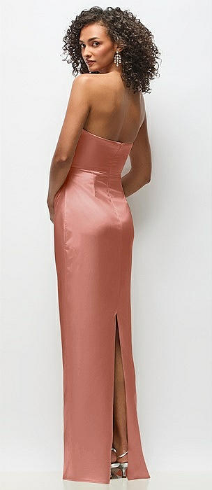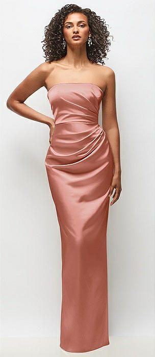 Strapless Draped Bodice Stretch Satin Column Maxi Dress in desert rose