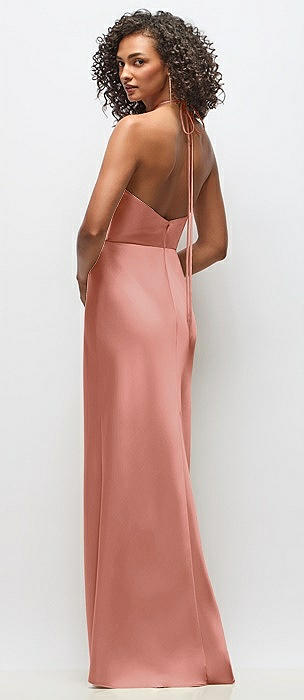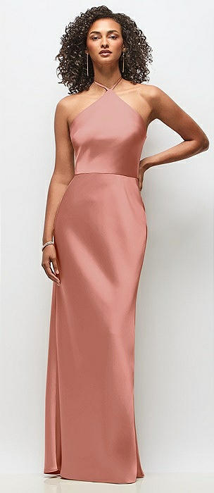 High-Neck Halter Stretch Satin Maxi Dress with Bias A-line Skirt in desert rose