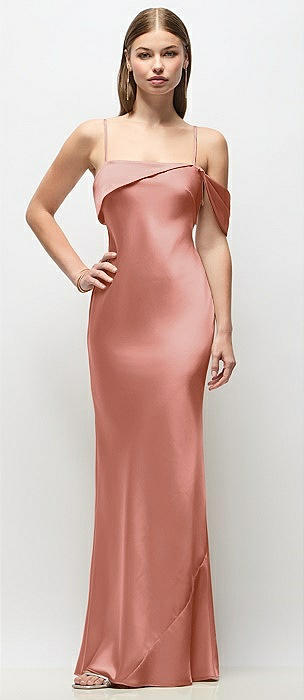 Asymmetrical Cuff Neck Stretch Satin Bias Maxi Dress with Adjustable Spaghetti Straps in desert rose