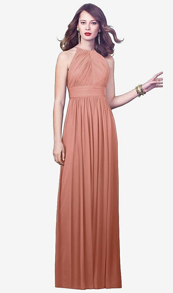 Generous shirring brings a glamorous look to this full-length lux chiffon dress. Its flattering draped bodice reflects a modified halter silhouette. Enjoy an alluring open back, and a shirred inset midriff and skirt.