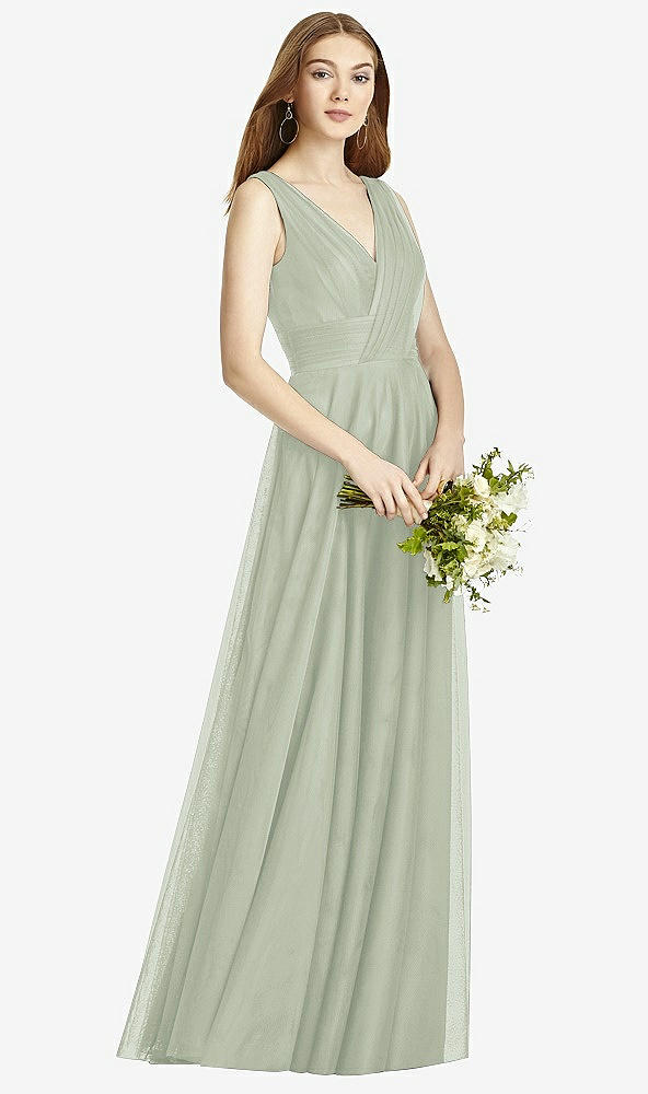 Charmingly elegant, this full-length V-neck dress features romantic draped detail at the neckline. Soft tulle enhances a slight shirring at the center of the front skirt for upgraded poise.