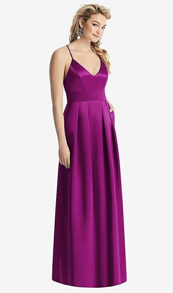 Front View - Persian Plum Pleated Skirt Satin Maxi Dress with Pockets