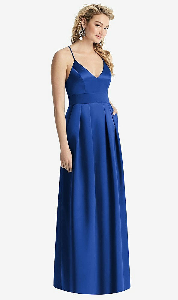 Front View - Sapphire Pleated Skirt Satin Maxi Dress with Pockets