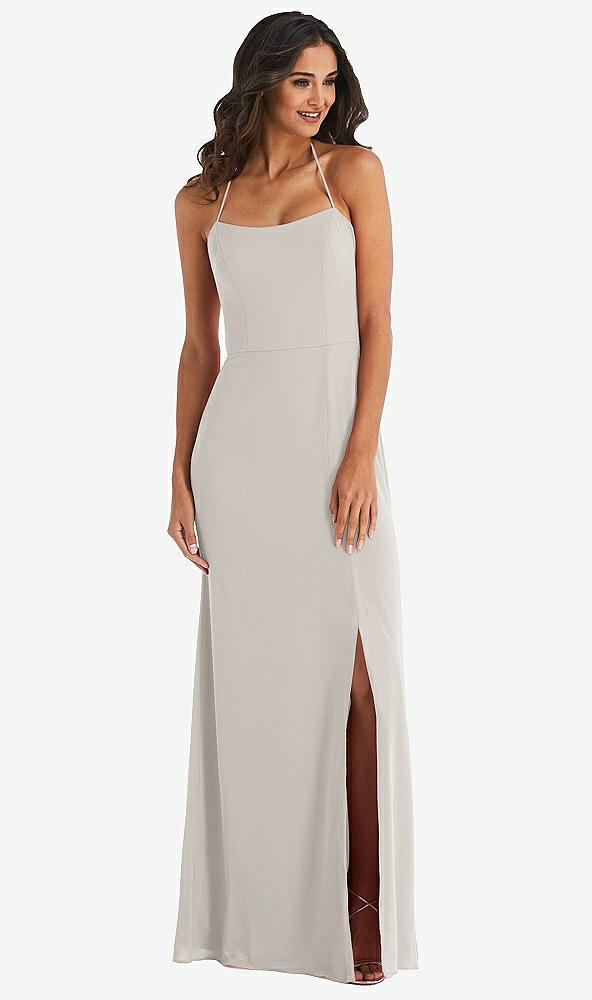 Side View - Oyster Spaghetti Strap Tie Halter Backless Trumpet Gown
