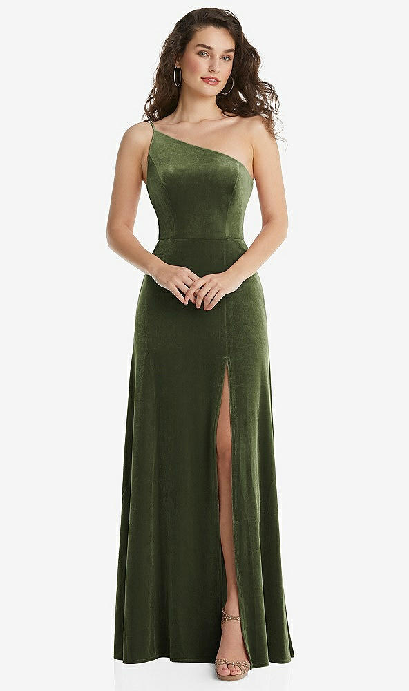 Front View - Olive Green One-Shoulder Spaghetti Strap Velvet Maxi Dress with Pockets