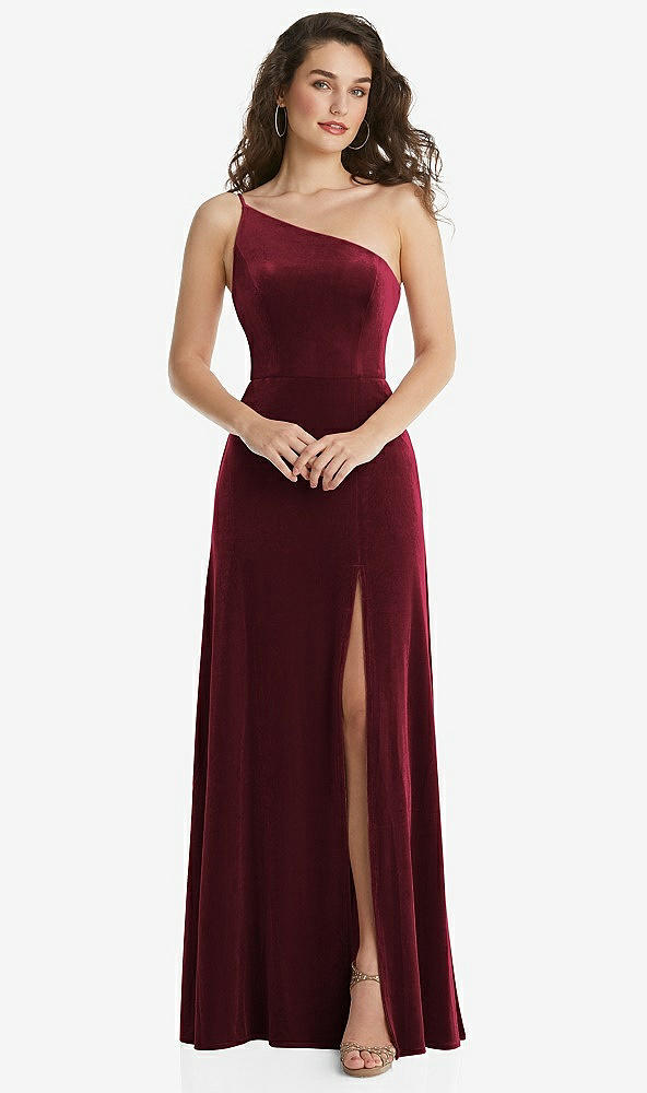 Front View - Cabernet One-Shoulder Spaghetti Strap Velvet Maxi Dress with Pockets