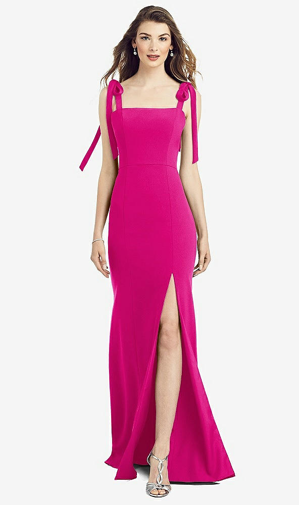 Front View - Think Pink Flat Tie-Shoulder Crepe Trumpet Gown with Front Slit