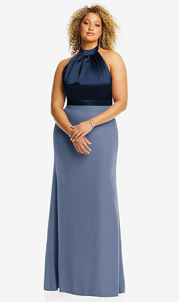 High-Neck Open-Back Maxi Dress with Scarf Tie in Larkspur Blue & Midnight Navy
