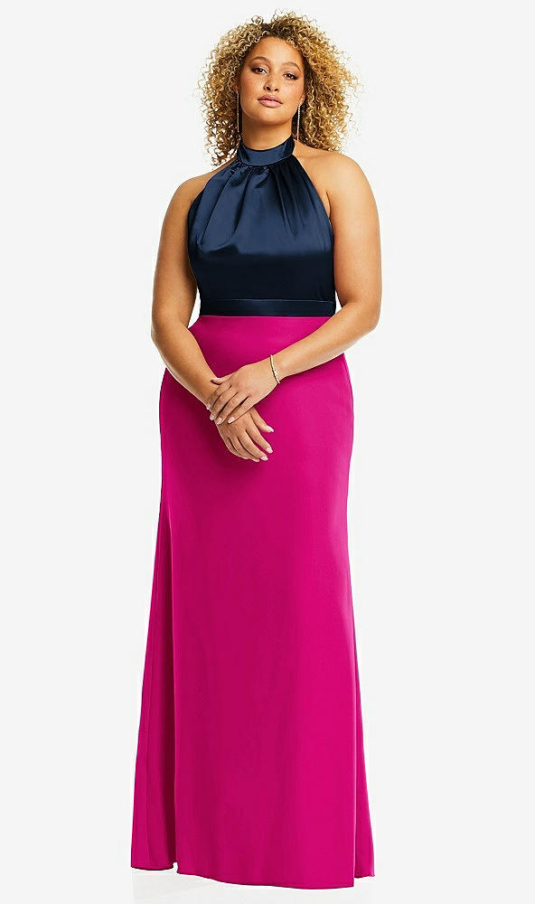 High-Neck Open-Back Maxi Dress with Scarf Tie in Think Pink & Midnight Navy