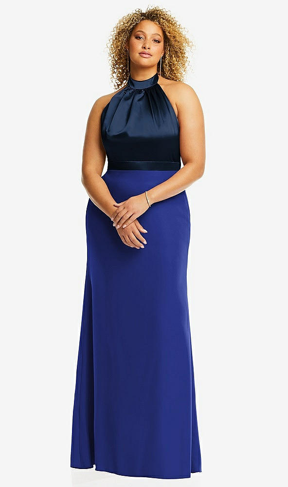 High-Neck Open-Back Maxi Dress with Scarf Tie in Cobalt Blue & Midnight Navy