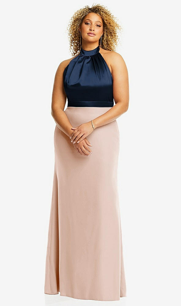 High-Neck Open-Back Maxi Dress with Scarf Tie in Cameo & Midnight Navy